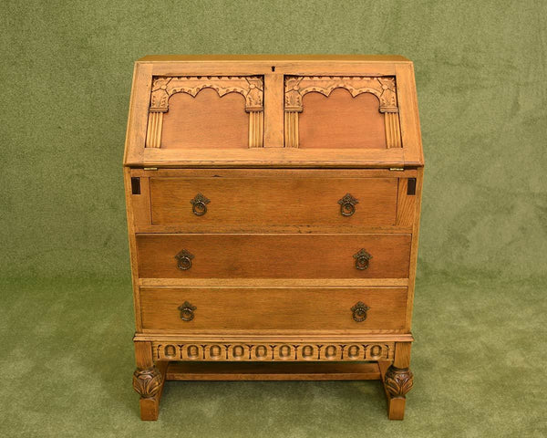 The carved lefs and drop handles hark back to the style of the 1920s, when this style of furniture really came into its own. The top opens to provide a good sized wood writing desk perfect for scribing letters to loved ones. There are also several compartments for correspondence and stationary.