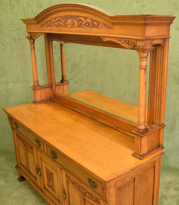 This truly is a tremendous piece of Arts and Crafts oak furniture with beautiful carving and magnificently sized mirror.